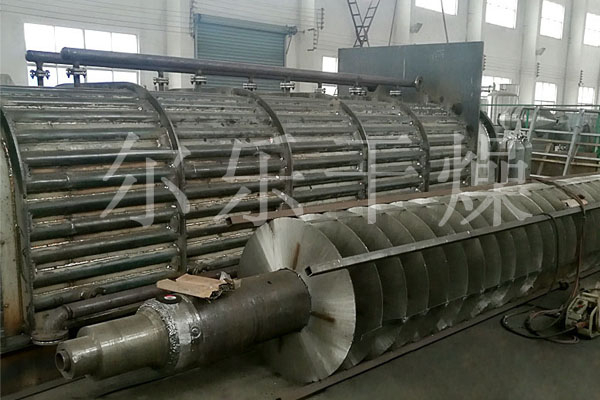 圓盤攪拌干燥機(jī)是以導(dǎo)熱油或蒸汽作為加熱介質(zhì),軸端裝有熱介質(zhì)導(dǎo)入、導(dǎo)出的旋轉(zhuǎn)接頭。加熱介質(zhì)進(jìn)入干燥機(jī)轉(zhuǎn)子內(nèi)腔,將轉(zhuǎn)子加熱以傳導(dǎo)加熱的方式對(duì)污泥進(jìn)行加熱干燥。同時(shí)在干燥機(jī)的筒體夾套內(nèi)也導(dǎo)入加熱介質(zhì)對(duì)污泥物料進(jìn)行加熱干燥,蒸發(fā)污泥中的水分。